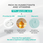 It contains 10% glycolic acid, to stimulate exfoliation and promote the renewal of skin cells.