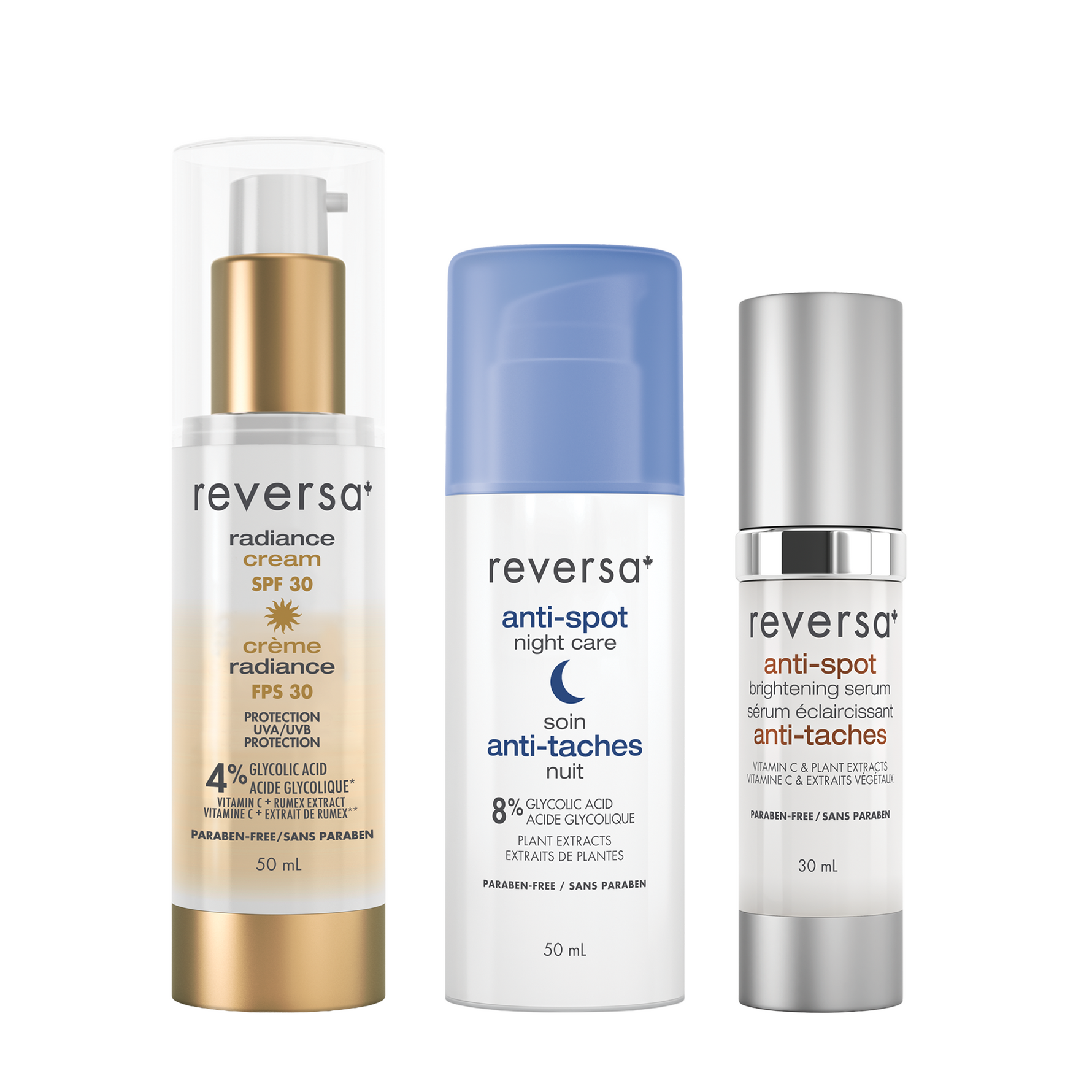 - radiance cream SPF 30: This light and moisturizing day cream with sunscreen, 4% glycolic acid, vitamin C and Rumex occidentalis extract, protects against UVA and UVB sun rays, brightens the complexion while providing anti-aging benefits.
